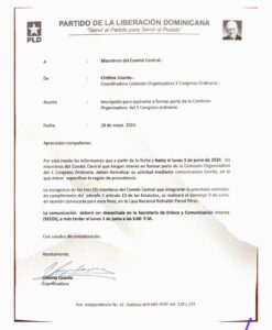 Así lo aclara una comunicación dirigida a los miembros del partido morado por parte de Cristina Lizardo, coordinadora de la Comisión Organizadora del X Congreso Ordinario.
