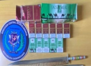 Durante el primer allanamiento, realizado en el colmado “Rafelito”, ubicado en la calle principal del sector La Ceiba, Villa Tapia, las autoridades ocuparon dos paquetes de cigarrillos ilegales de distintas marcas, que contenían un total de 11 cajetillas, así como un puñal de aproximadamente 64 centímetros de longitud.
