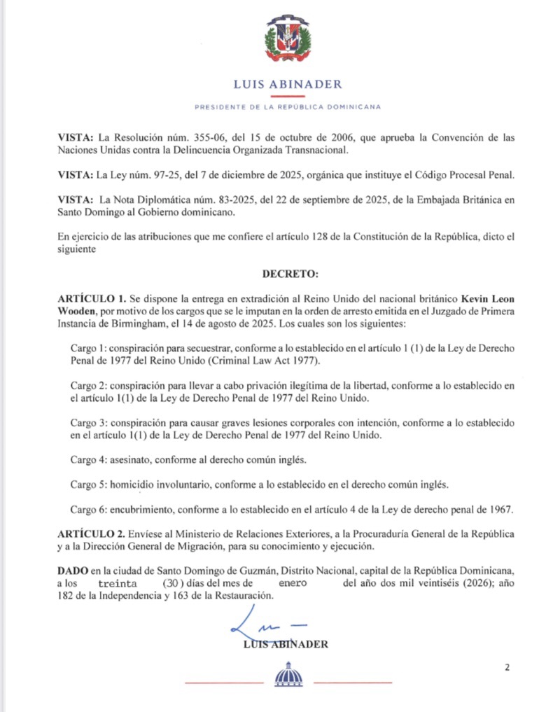 Santo Domingo. – El Poder Ejecutivo emitió este viernes 30 de enero los decretos No. 58-26 y 59-26 que disponen, respectivamente, la entrega en extradición del nacional británico Kevin Leon Wooden y del nacional dominicano Roberto Severino Hinojosa.