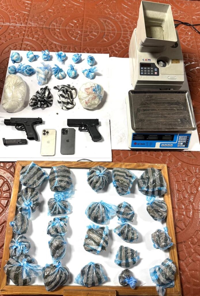 También se incautaron cuatro balanzas, un peso digital, una máquina de contar monedas, dos armas de fuego, un arma no letal, una pistola de juguete y cinco celulares de diferentes marcas y modelos.