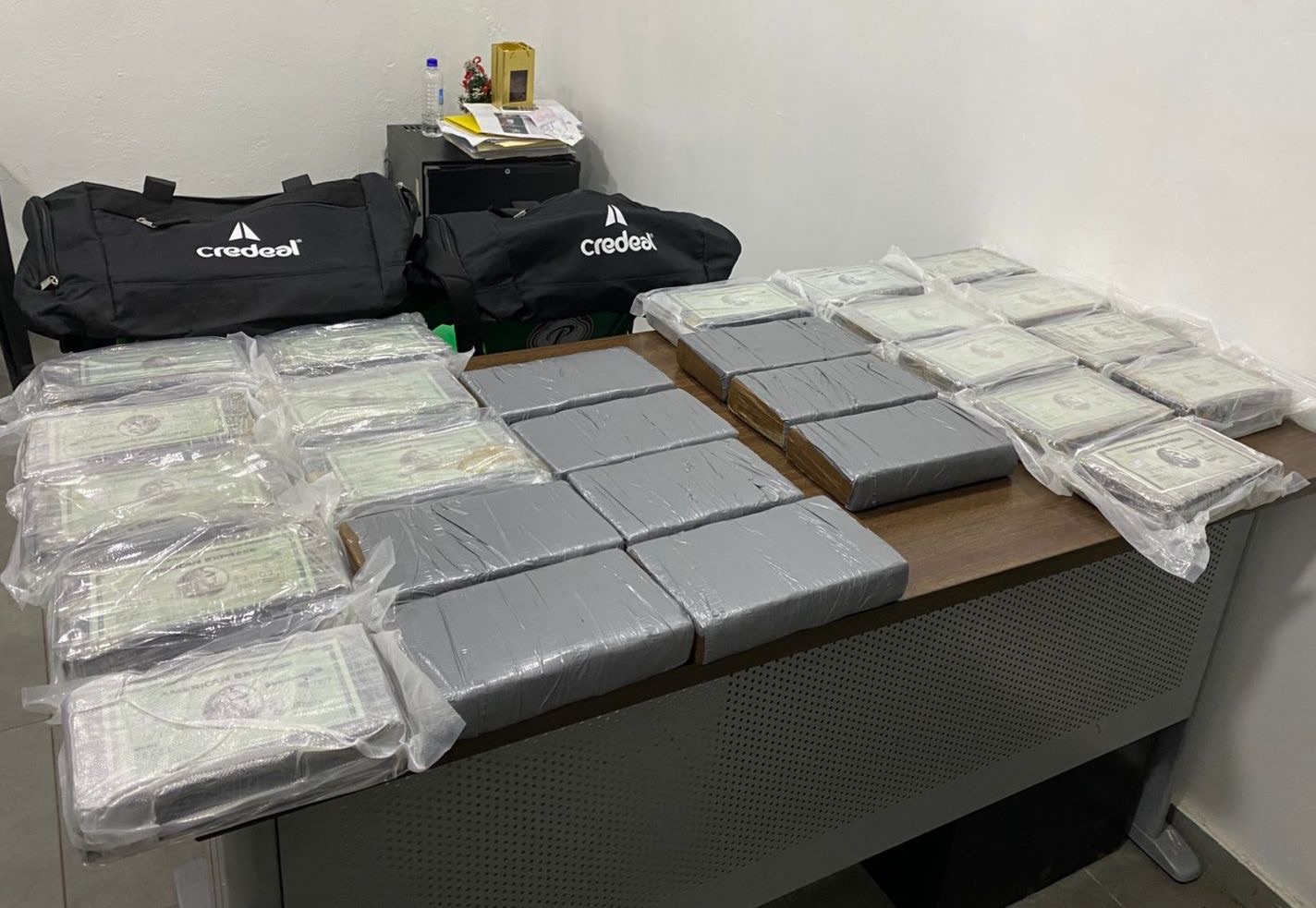 Asimismo, fueron ocupadas como evidencias dos bultos de color negro que contenían la sustancia incautada, cinco tarjetas bancarias (crédito y débito), un cargador portátil y la suma de RD$6,200.00 en efectivo.
