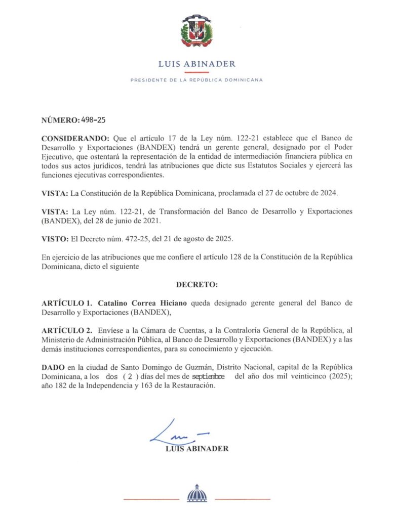 Santo Domingo. –El presidente Luis Abinader mediante el Decreto núm. 498-25 designó a Catalino Correa Hiciano como gerente general del Banco de Desarrollo y Exportaciones (BANDEX).