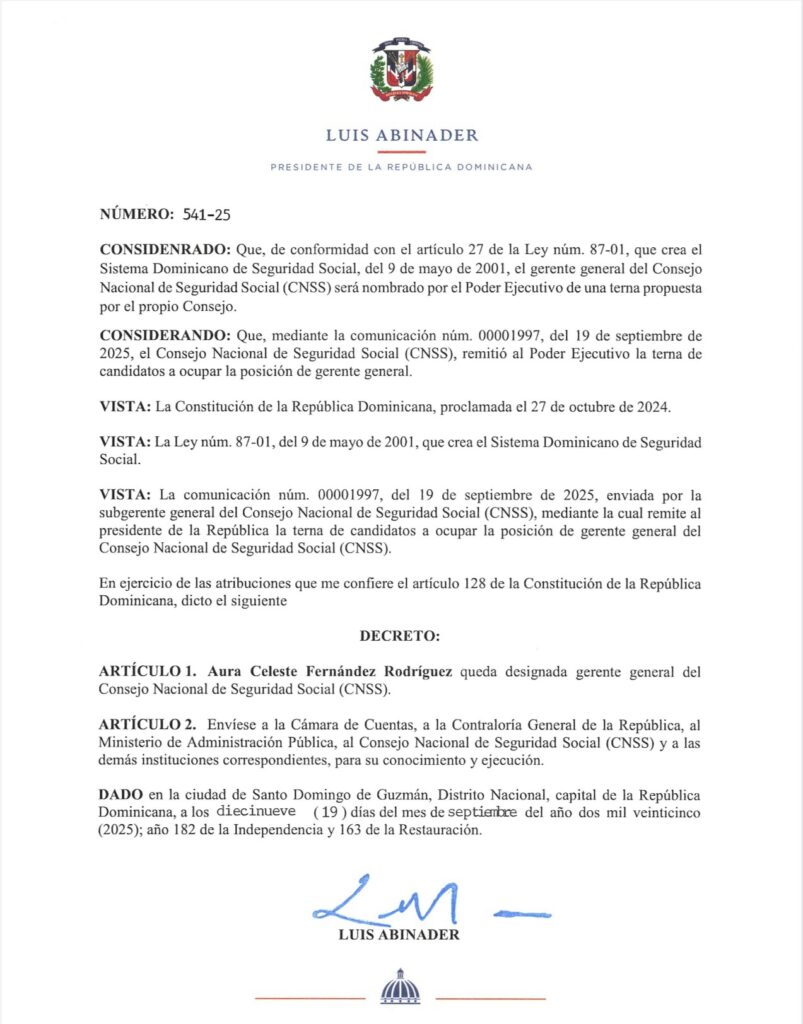 Santo Domingo.-El presidente Luis Abinader designó a la doctora Aura Celeste Fernández Rodríguez como Gerente General del Consejo Nacional de la Seguridad Social, CNSS, mediante el Decreto núm. 541-25, emitido en esta fecha.