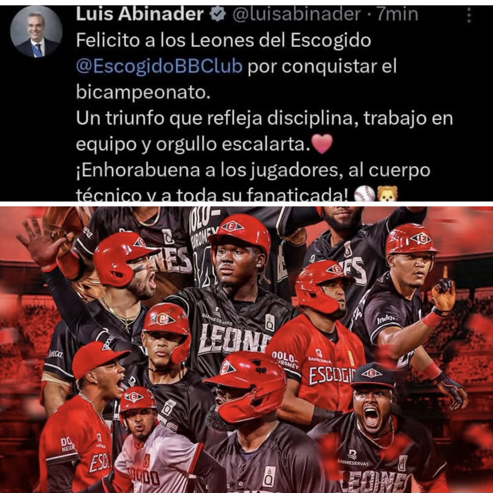 “El bicampeonato alcanzado por los Leones del Escogido es reflejo de esfuerzo, constancia y compromiso. Felicidades a los jugadores, al cuerpo técnico y a toda su fanaticada”, expresó el jefe de Estado.