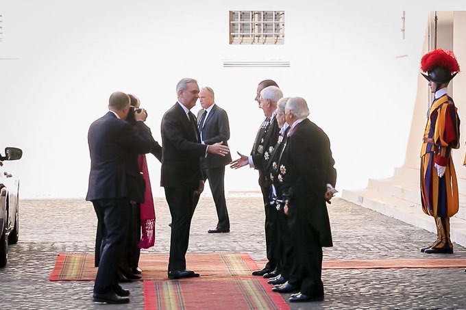 El jefe de Estado y sus acompañantes fueron recibidos por el cortejo de los gentiles hombres de Su Santidad, Monseñor Leonardo Sapienza, Regente de la Prefectura de la Casa Pontificia, y el jefe de Protocolo, Monseñor Javier Fernández G.