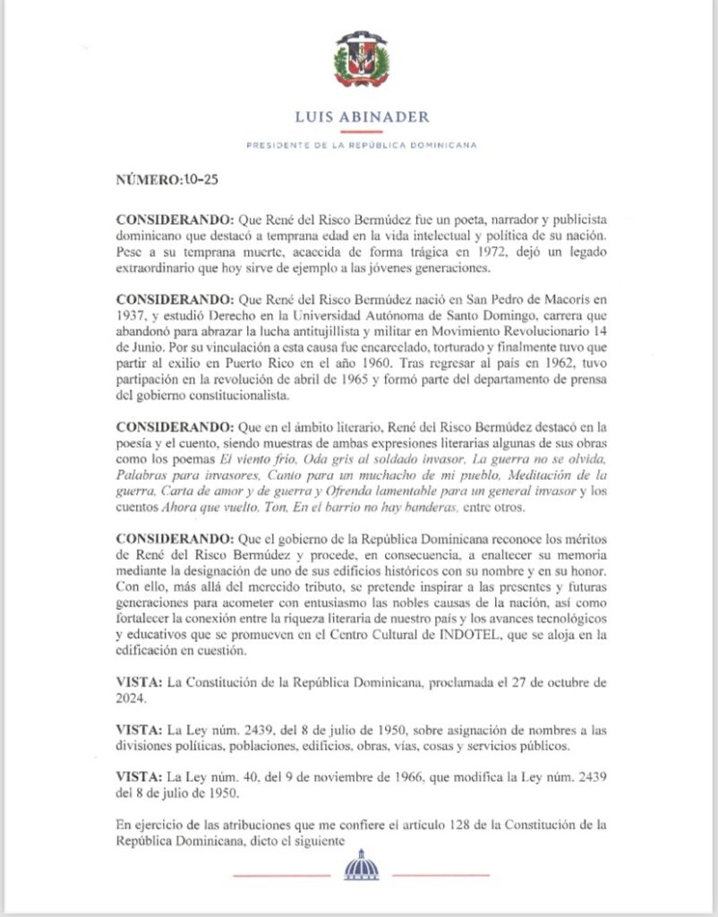 El pasado miércoles 15 de enero de 2025, el presidente Luis Abinader emitió el Decreto núm. 10-15, mediante el cual dispuso que designe con el nombre René del Risco Bermúdez, el edificio ubicado en la calle Isabel la Católica, núm. 214, en el que opera el Centro Cultural de Indotel.