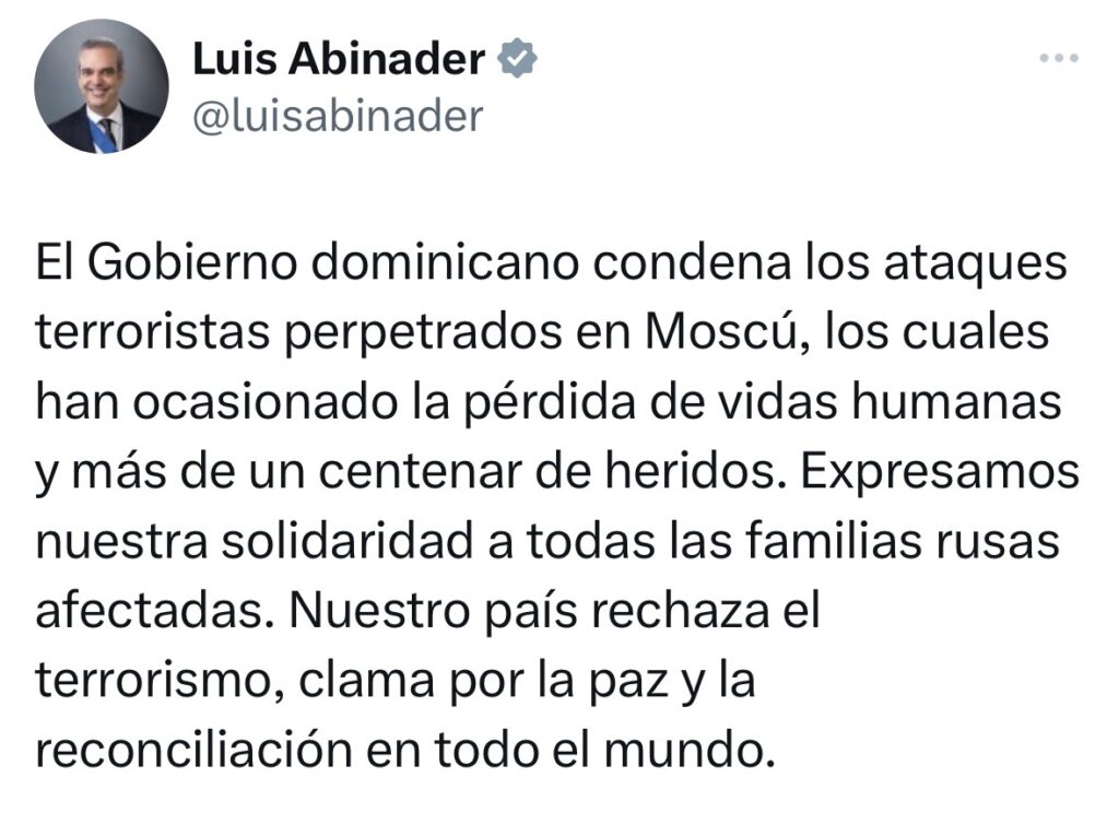 El Gobierno dominicano se solidariza con todas las familias rusas afectadas por estos trágicos sucesos y envía sus más sinceras condolencias. En momentos tan difíciles, el pueblo dominicano se une al pueblo ruso en el dolor y la tristeza que esta tragedia ha provocado.