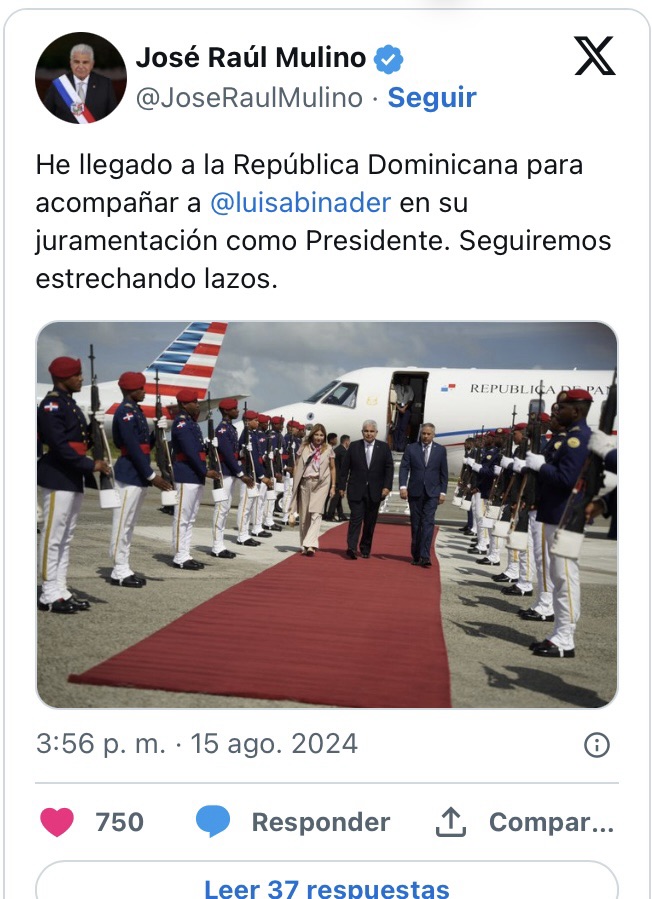 Al respecto, el mandatario panameño expresó a través de su cuenta en la red social X (anteriormente conocida como Twitter): “He llegado a la República Dominicana para acompañar a Luis Abinader en su juramentación como Presidente. Seguiremos fortaleciendo los lazos entre nuestras naciones”.