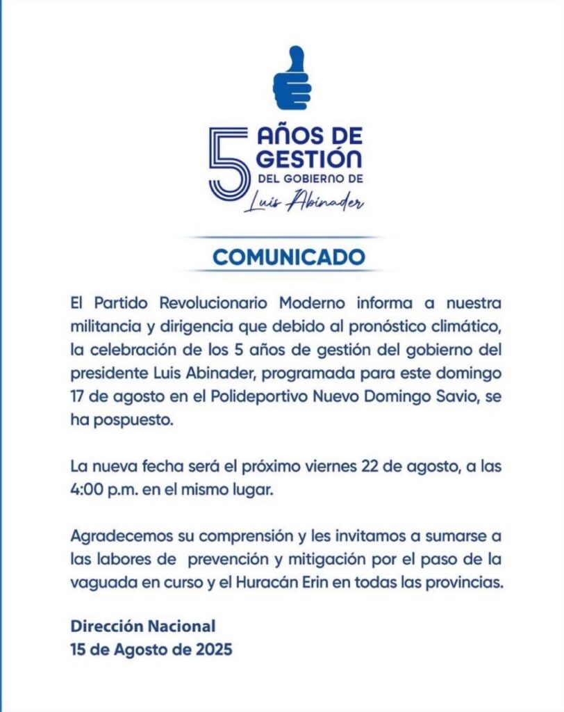 “El Partido Revolucionario Moderno informa a nuestra militancia y dirigencia que debido a las condiciones climáticas, la celebración de los 5 años de gestión del gobierno del presidente Luis Abinader, programada para este domingo 17 de agosto en el Polideportivo Nuevo Domingo Savio, se ha pospuesto”, indica un comunicado.