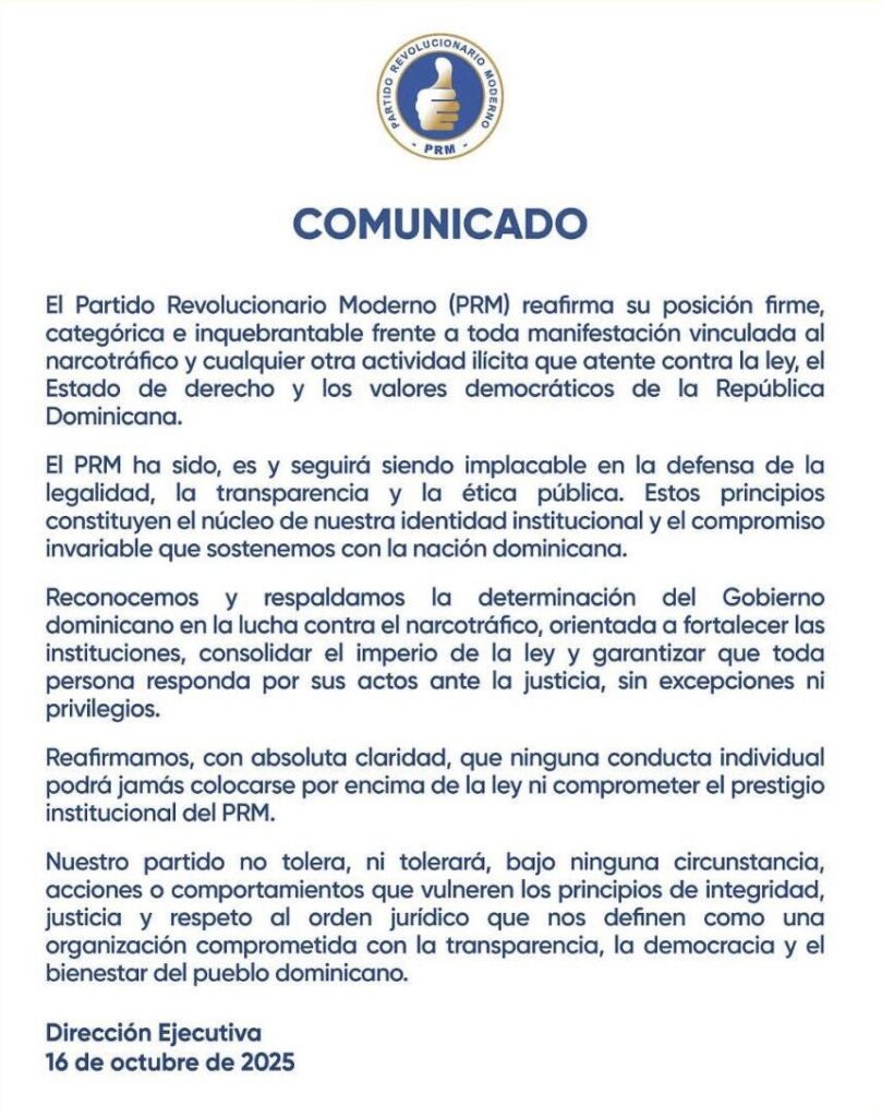 Santo Domingo-El Partido Revolucionario Moderno (PRM) reafirmó con total claridad que ninguna acción o conducta individual podrá situarse por encima de la ley ni comprometer el prestigio institucional de esa organización política.