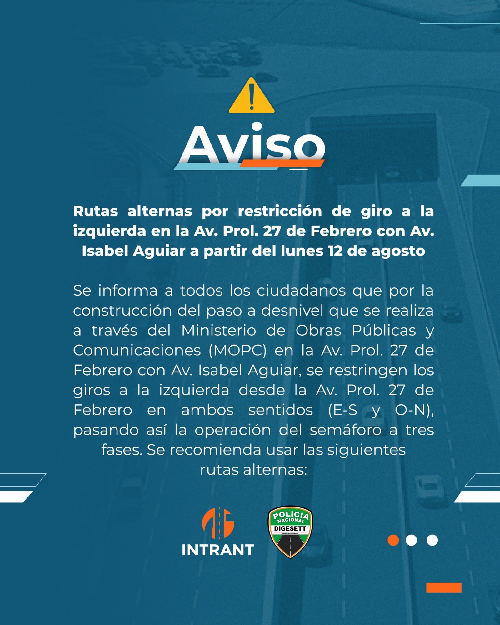 En ese sentido, se informa a todos los ciudadanos que transitan por la referida intersección, que debido a los trabajos de construcción, se prohíben los giros a la izquierda desde la avenida 27 de Febrero e Isabela Aguilar en dirección Este-Sur y Oeste -Norte.