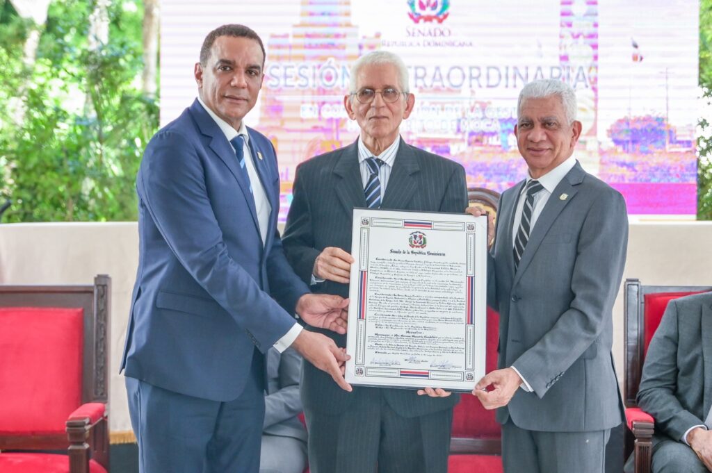 Tras concluir los trabajos legislativos, el senador Carlos Gómez hizo entrega de un pergamino de reconocimiento al educador, poeta cuentista, cineasta, ensayista y crítico literario, Bruno Rosario Candelier, por sus aportes al arte y la literatura.