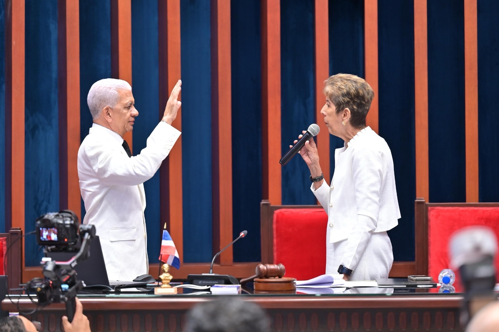 Los senadores Ricardo de los Santos y Pedro Catrain tomaron juramento de sus nuevas funciones por la senadora Ginnete Bournigal de Jiménez, en un acto solemne celebrado en el Salón del Hemiciclo, dando cumplimiento a los artículos 89 y 90 de la Constitución de la República, y a lo estipulado por el Reglamento del Senado.