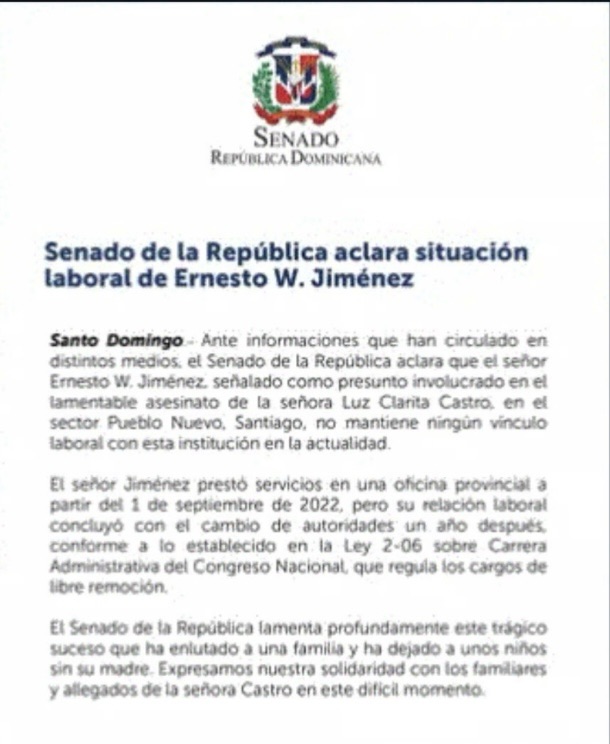 Santiago. – El Senado de la República aclaró que Ernesto W. Jiménez, señalado como el responsable de la muerte de su expareja, Luz Clarita Castro, en Santiago, no tiene actualmente ninguna relación laboral con esa institución.