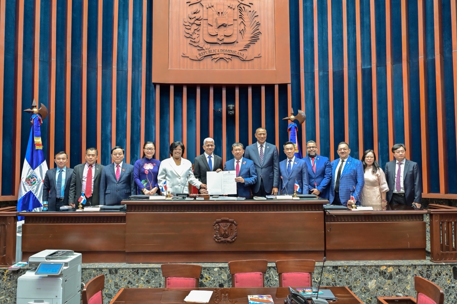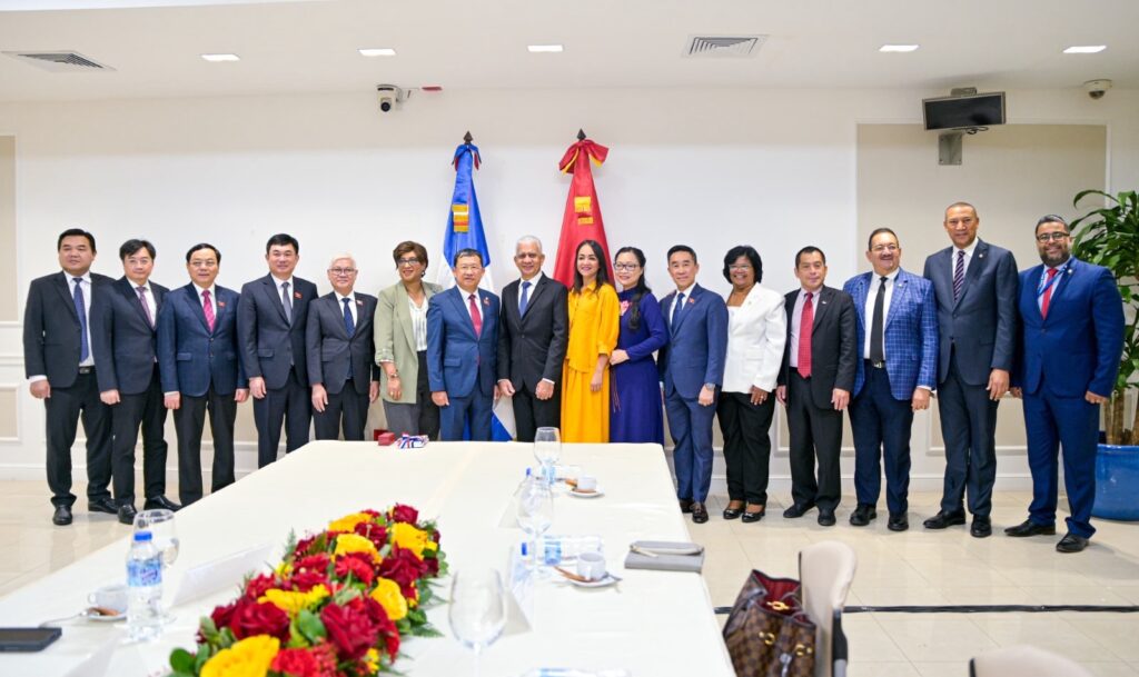 SANTO DOMINGO. – El presidente del Senado de la República, Ricardo de los Santos, junto a una delegación de senadores, recibió la visita de una Comisión de Relaciones Exteriores de la Asamblea Nacional de Vietnam, a quienes entregó una resolución aprobada por el pleno que oficializa la conformación del grupo parlamentario de amistad entre ambas sedes legislativas.