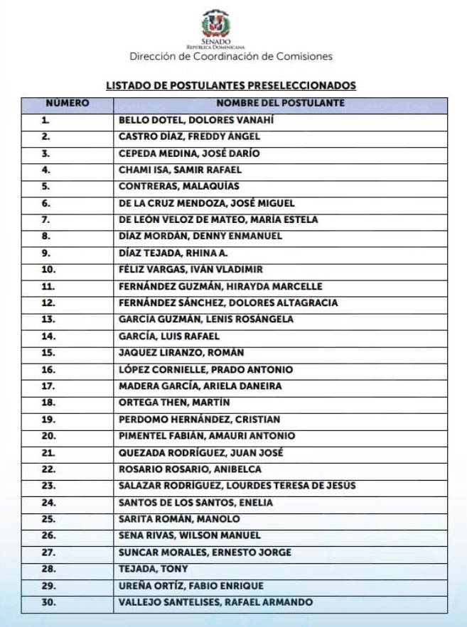 La comisión especial del Senado de la República Dominicana ha seleccionado a 30 aspirantes para integrar la nueva Junta Central Electoral (JCE). Este grupo incluye a cinco miembros actuales y sus suplentes, junto a otros 20 postulantes, todos con la posibilidad de renovar el organismo electoral.