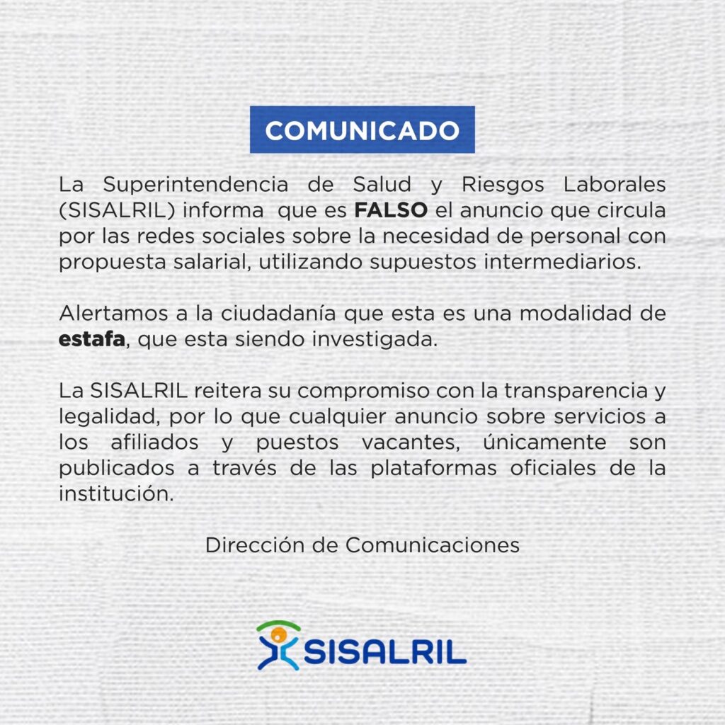 La Superintendencia de Salud y Riesgos Laborales (SISALRIL) informa que es FALSO el anuncio que circula por las redes sociales sobre la necesidad de personal con propuesta salarial, utilizando supuestos intermediarios.