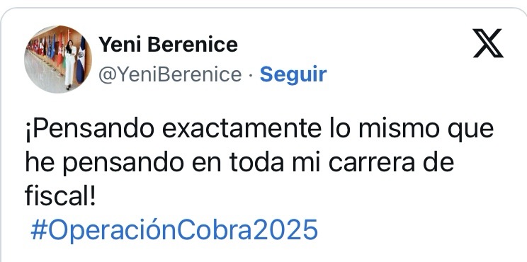Mediante un mensaje difundido en su cuenta de la red social X, Reynoso expresó: “¡Pensando exactamente lo mismo que he pensado en toda mi carrera de fiscal!”, en referencia a la denominada operación Cobra, con la que el Ministerio Público desmanteló una presunta red de corrupción administrativa.