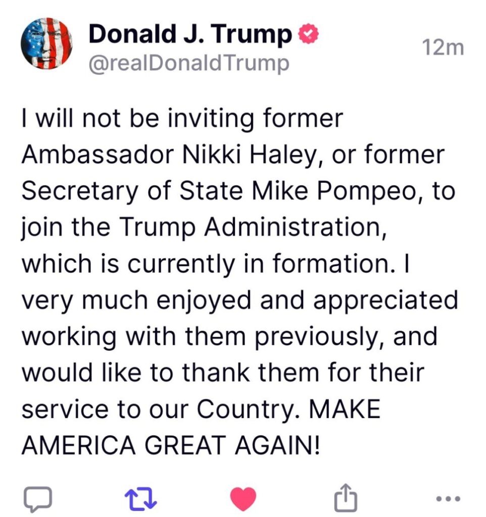 No voy a invitar al ex embajador Nikki Haley, o al ex secretario de Estado Mike Pompeo, a unirse a la Administración Trump, que actualmente está en formación. Disfruté y aprecié mucho trabajar con ellos anteriormente. y me gustaria agradecerles por su servicio a nuestro país. ¡HAZ A AMÉRICA GRANDE OTRA VEZ. escribió.
