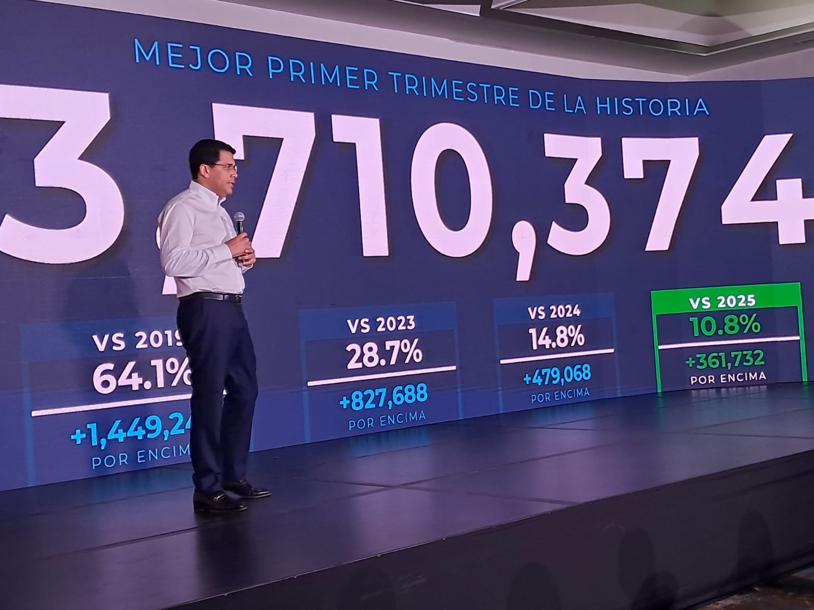 En su ya tradicional conferencia de prensa, donde da a conocer el comportamiento del turismo y su impacto en la economía, Collado  informó que la llegada 3,710,374 visitantes en los primeros tres meses de este año, lo que representa un crecimiento 64.1% frente al 2019, 28,7% respecto al 2023, 14,8% en comparación con el 2024 y 10,8 con relación al año pasado.