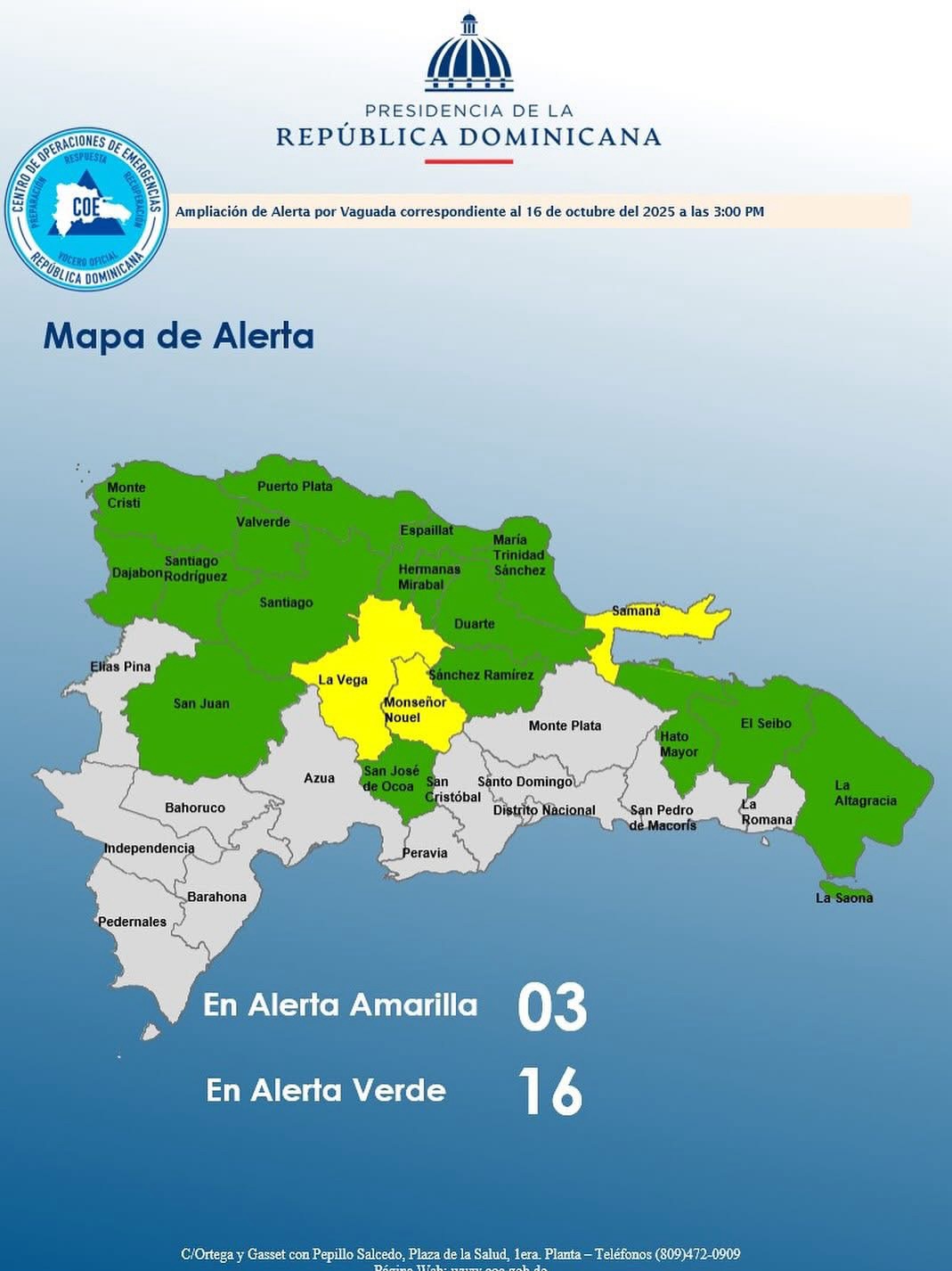 Las Provincias bajo alerta son: Sánchez Ramírez, El Seibo, San Juan, Dajabón, La Romana, Samaná, San Cristóbal, Azua, San José de Ocoa, Elías Piña, Valverde. Mientras en avisos: San Pedro de Macorís, Hato Mayor, Duarte, La Vega, Monte Plata, El Gran Santo Domingo, Monseñor Nouel, Monte Cristi, Santiago, Santiago Rodríguez, Espaillat, Puerto Plata, María Trinidad Sánchez, Hermanas Mirabal.