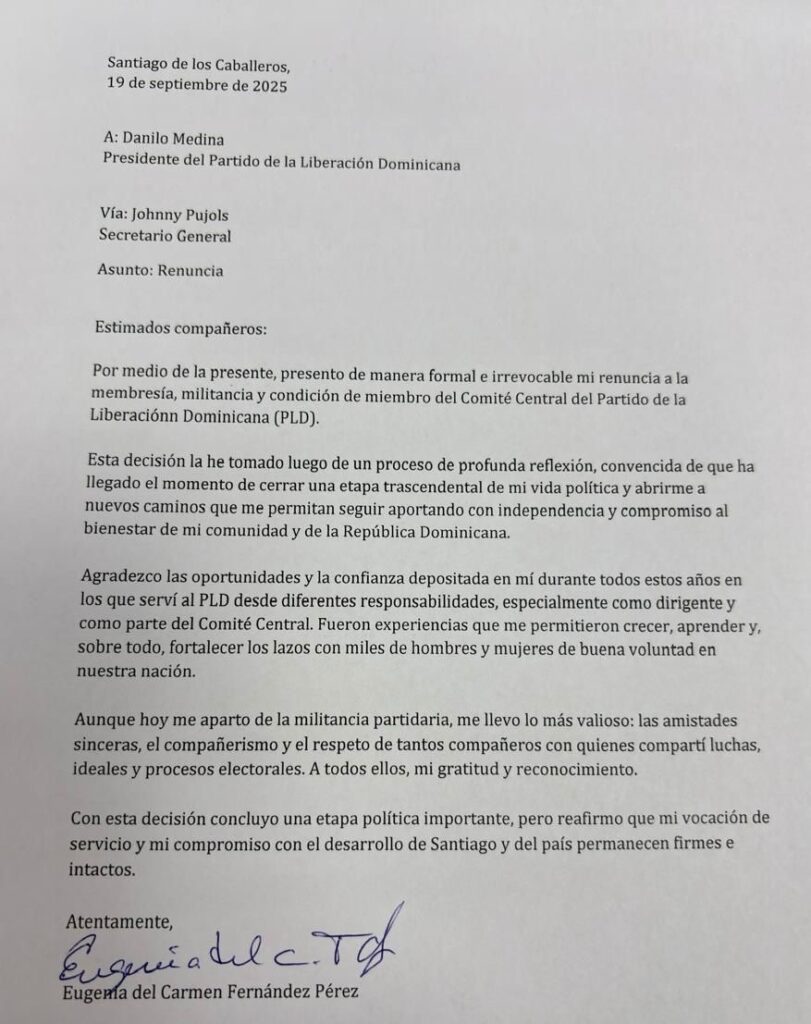 La instancia formal fue dirigida al presidente del partido, Danilo Medina Sánchez, y al secretario general, Johnny Pujols, donde la destacada militante presenta su renuncia irrevocable a la membresía, militancia y condición de miembro del Comité Central del PLD.